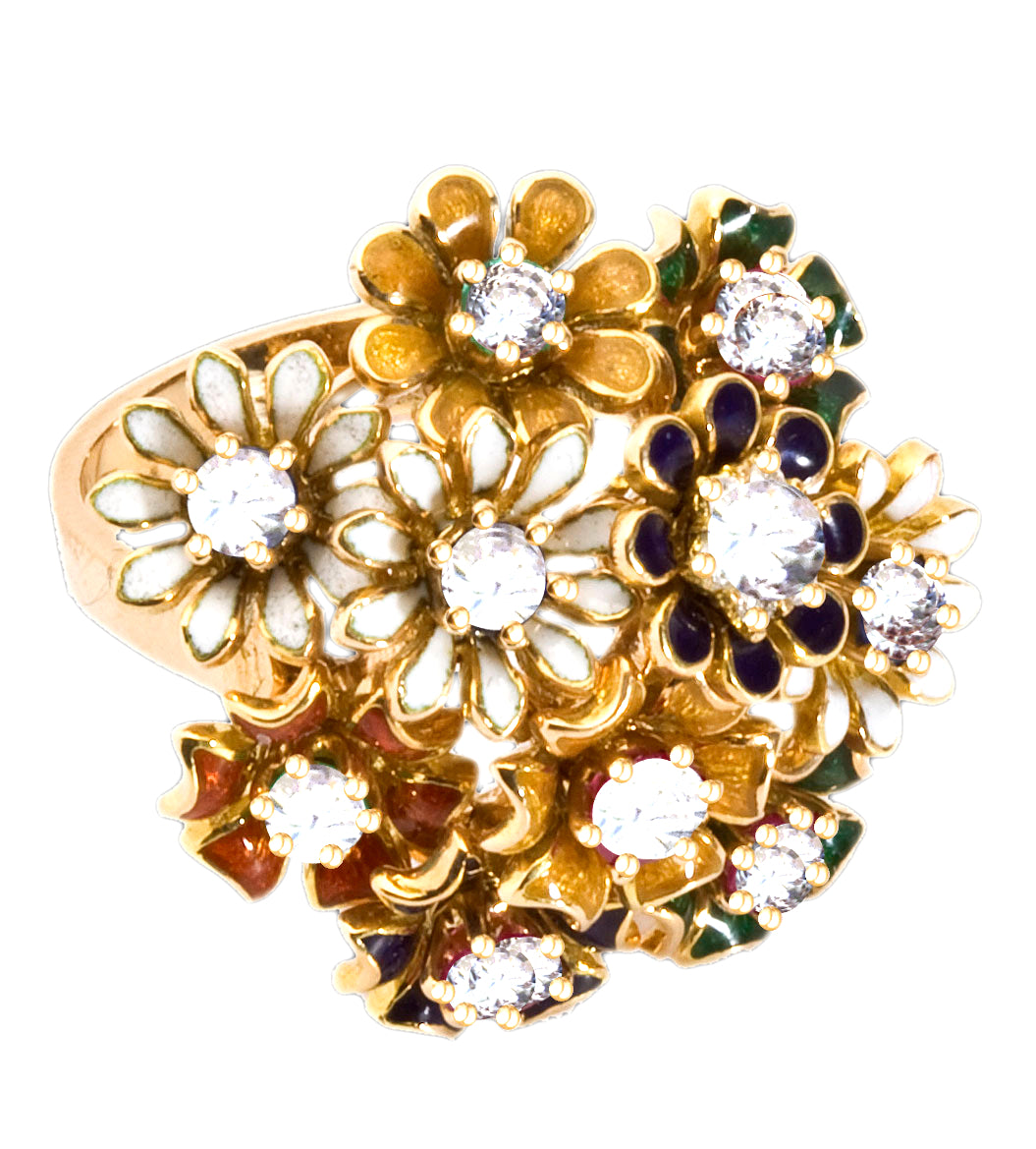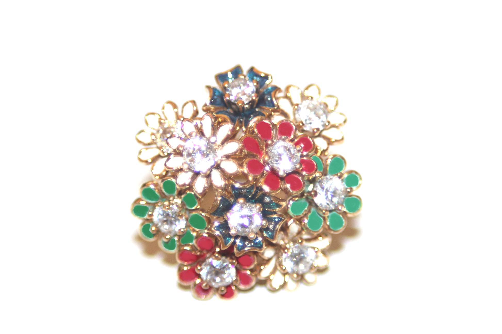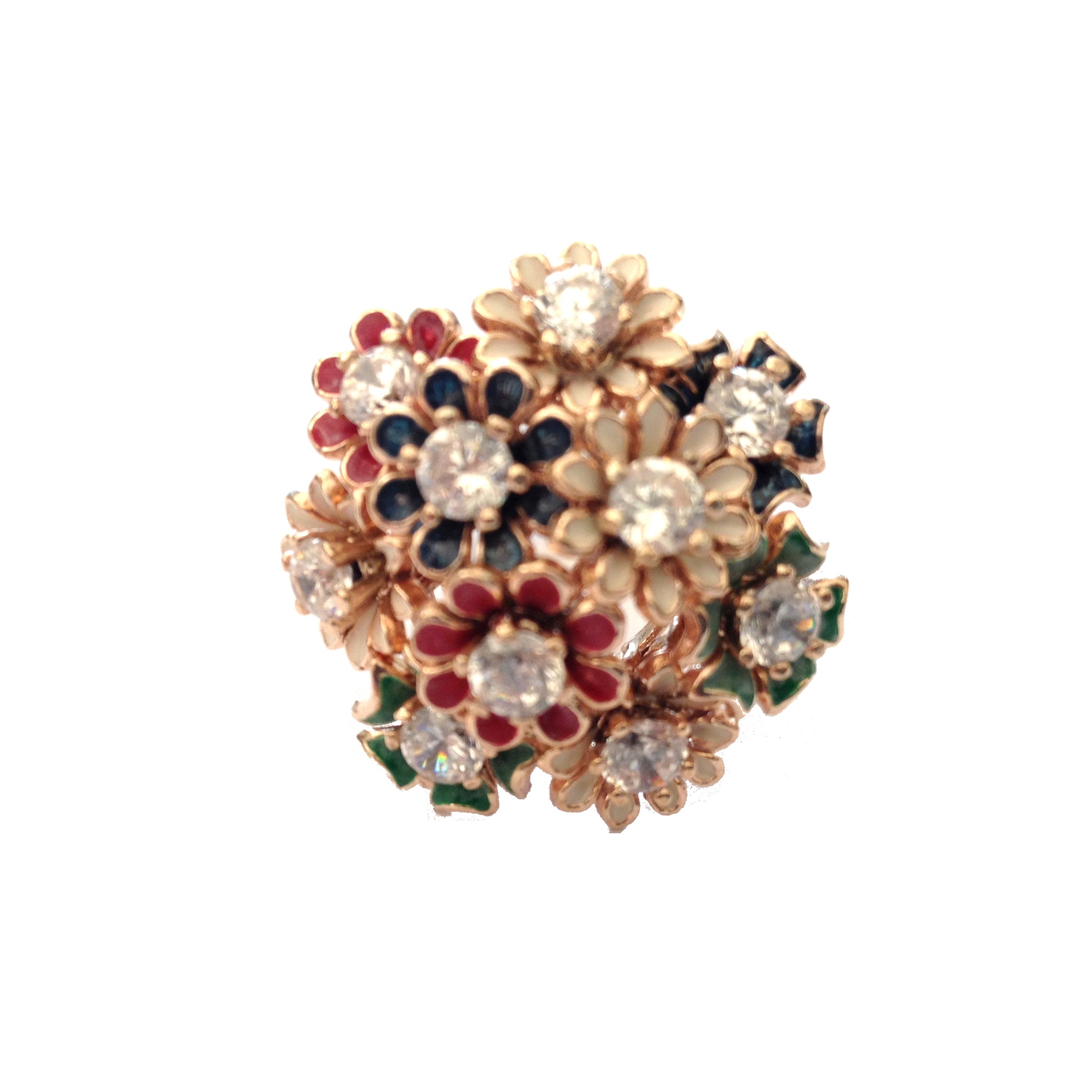 Anello cocktail a dieci fiori smaltati multicolor in argento 925 placcato oro rosa e zirconi, gambo a fascia.