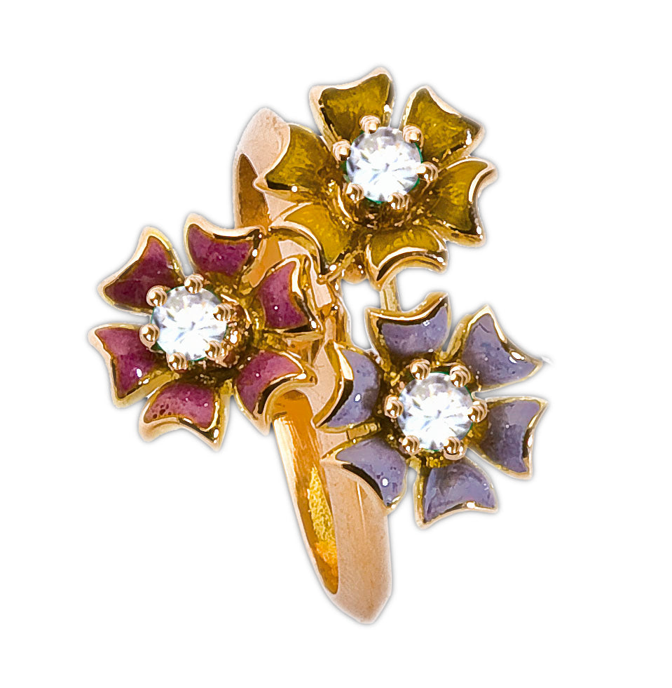 Anello a tre fiori smaltati multicolor in argento 925 placcato oro rosa e zirconi, gambo a schiena.