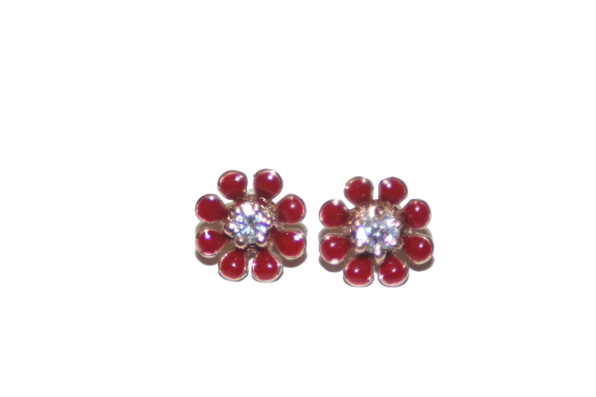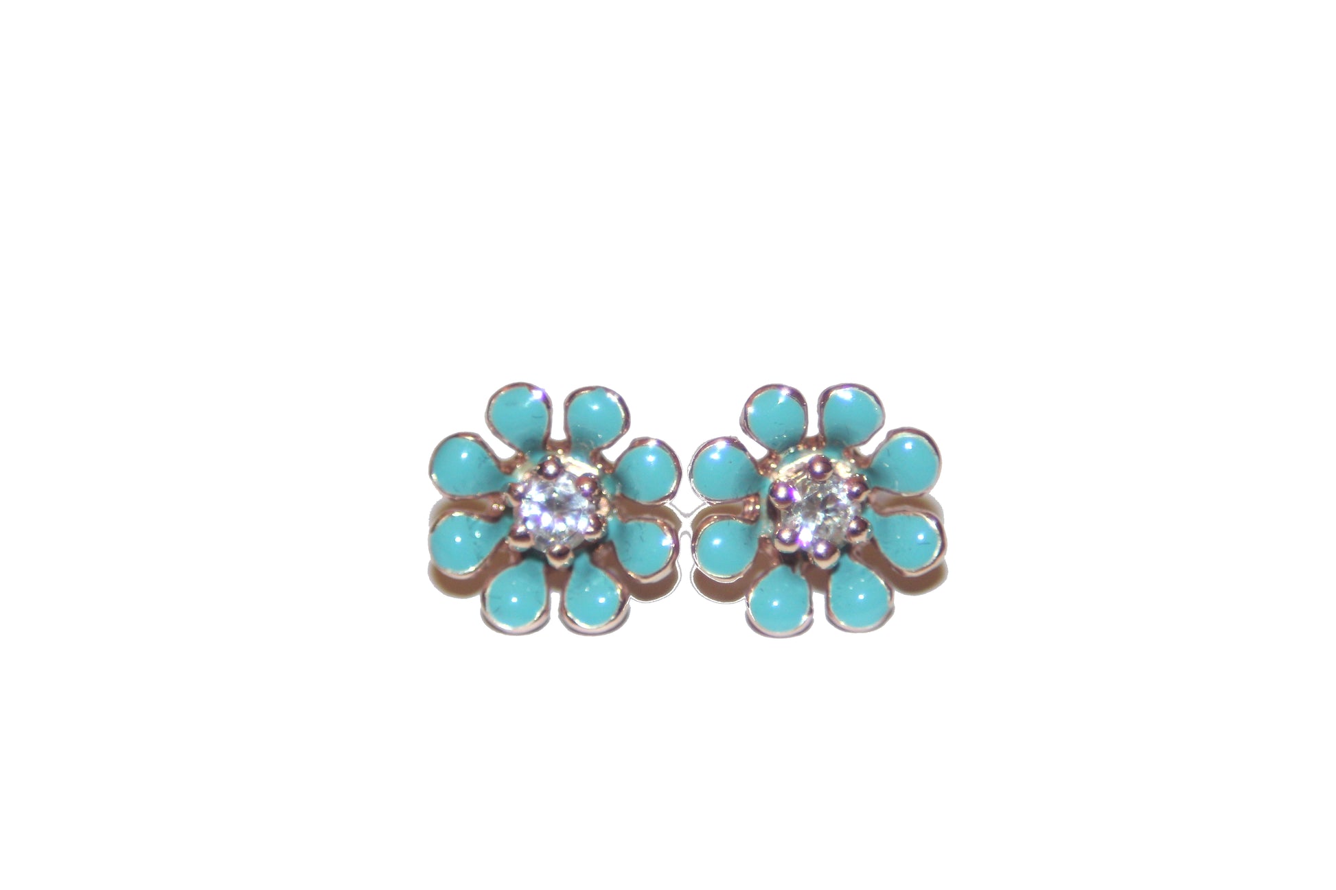 Orecchini a lobo fiore smaltato e zircone in argento 925 galvanica oro rosa 18kt. chiusura perno e farfallina.